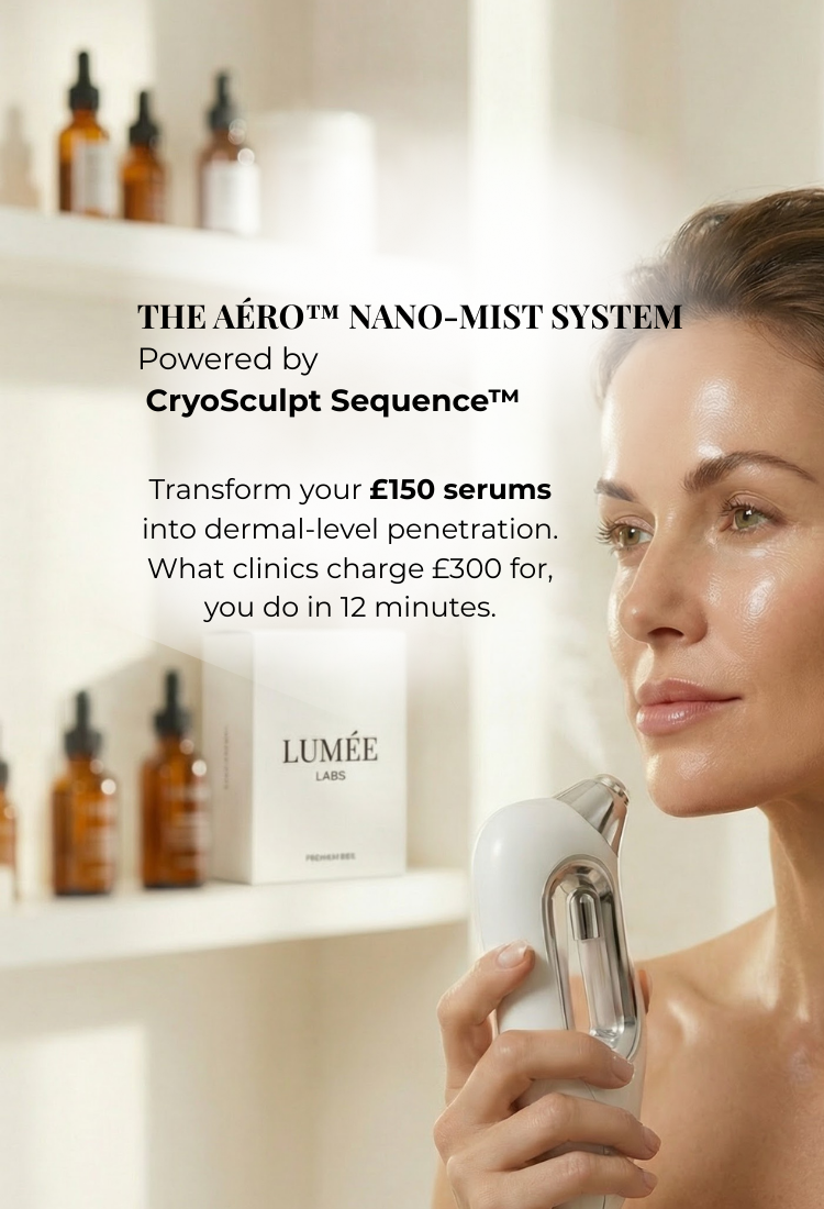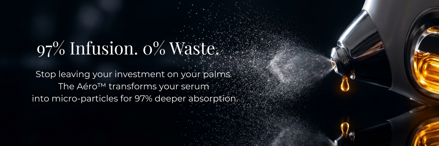 Generic misters spray water droplets (50-100 microns) that sit on your skin surface and evaporate in minutes. The AÉRO uses 140,000 vibrations per second to shatter liquid into 0.3-micron nano-particles — 200x smaller than your pores. This allows actives to bypass your skin barrier and penetrate 3 dermal layers deep. You're not buying a mister. You're buying penetration technology that makes your £150 serums actually work instead of evaporating on the surface.